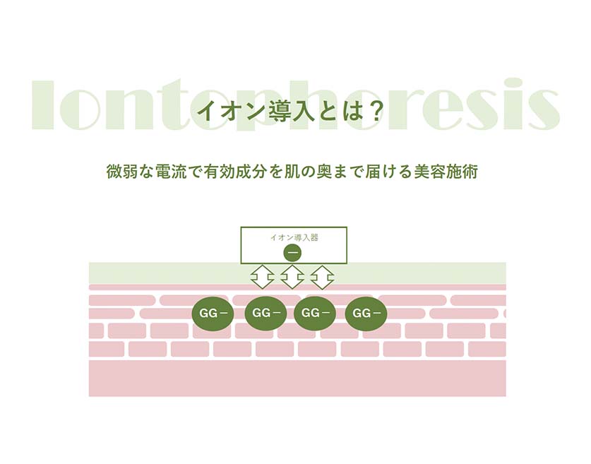 イオン導入とはイオンフォトレーシスともいい、普段のスキンケアでは肌の奥まで届きにくい水溶性の有効成分を、皮膚に弱い電流を流してイオン化することにより皮膚の深層まで浸透させる方法です。